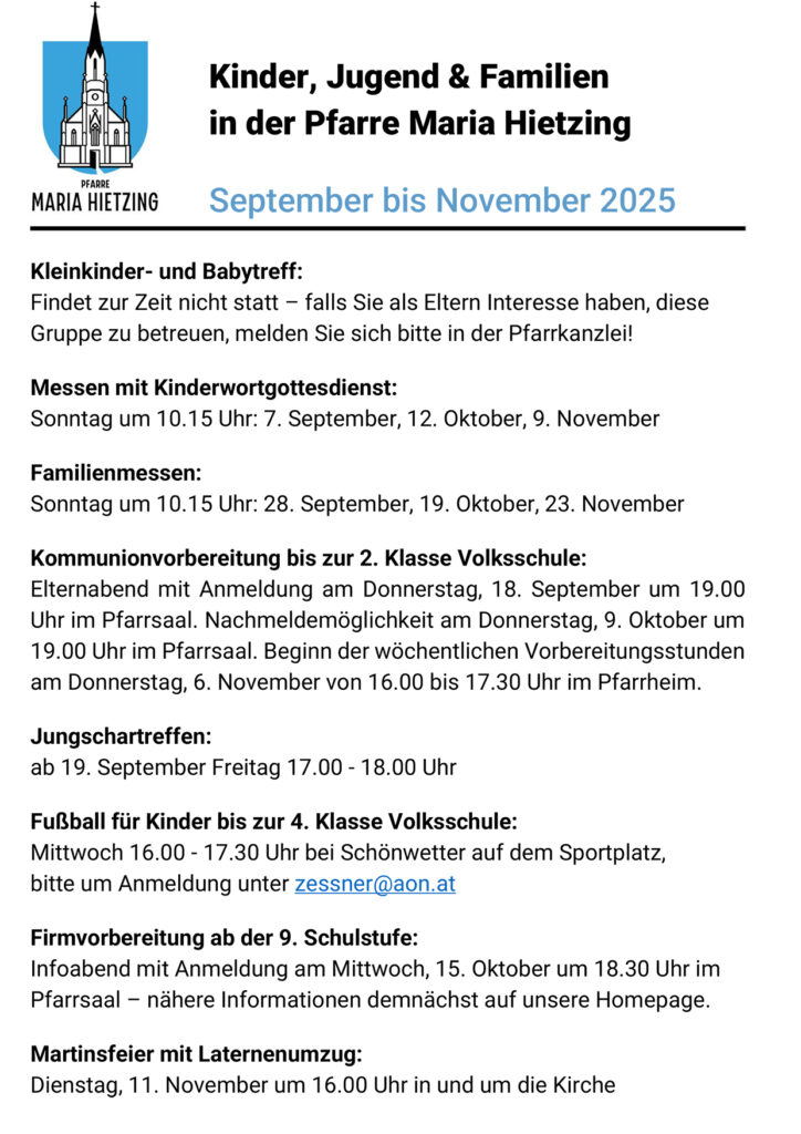 Bitte merken Sie sich den nächsten Termin unserer Veranstaltungsreihe vor: Donnerstag, 28. November 2024 um 18.30 Uhr im Pfarrsaal. Das Thema wird sobald wie möglich bekanntgegeben. Wir hoffen wieder auf regen Zulauf – entsprechend unserem Veranstaltungsmotto: „Sei dabei“!