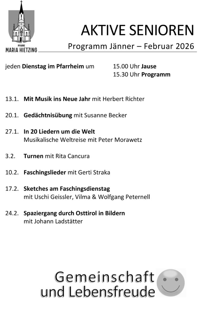 Alle Programmpunkte werden im Pfarrblatt und im Schaukasten vor der Kirche angekündigt. Jeder ist willkommen und es entstehen keine Verpflichtungen; falls Kostenbeiträge eingehoben werden, werden sie im Aushang angekündigt.